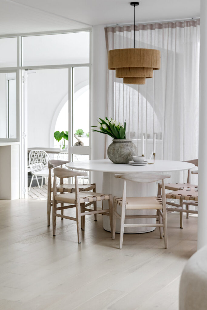 We highlighted the home’s generous proportions and heritage charm with a palette of soft neutrals, layered textures and refined touches. From deep green accents in the living area to a bold black dining table, the result is a home that feels elegant, balanced and inviting.